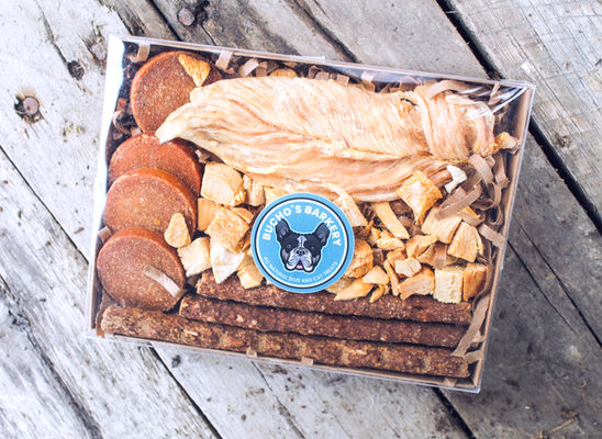 This is a 4 x 6 barkuterie box filled with drool worthy treats! Freeze-dried chicken breast cubes, dehydrated chicken breast tender, salmon & sweet potato rounds and beef sticks. Your pup will have treats for days!